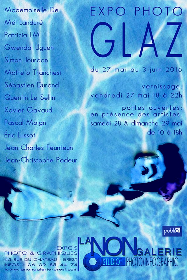 - GLAZ, photos de la série "Flux & Reflux", les week-end du 16,17,18 et du 23,24,25 septembre 2016 à La galerie Rouge, Pont 'L'Abbé ; du 15 juillet au 5 août 2016 à la galerie Miettes de Baleine, Douarnenez ; du 27 mai au 03 juin 2016 à LA NON-GALERIE, studio PhotoInfographique, Brest.
