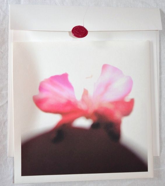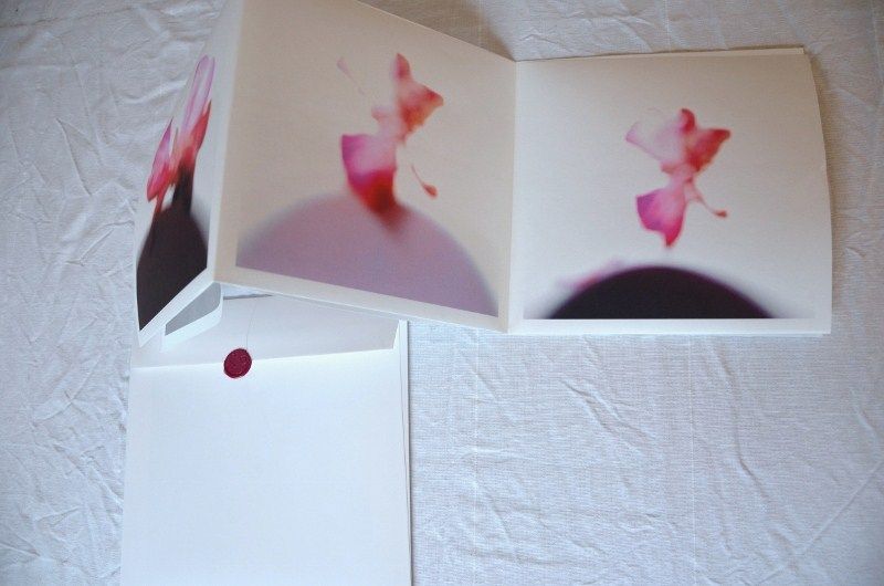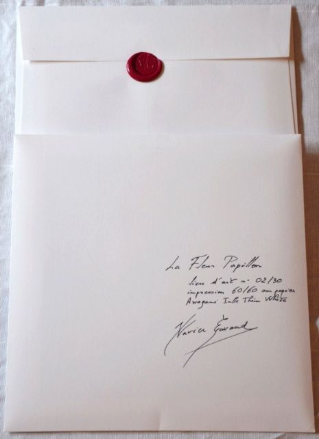 Présentation : enveloppe 220/220mm Velin Blanc, cachetée cire.